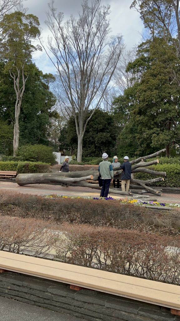 ニシゴリラの屋外展示場へのケヤキの伐採・運搬・設置という、貴重な場面に立ち会わせていただきました