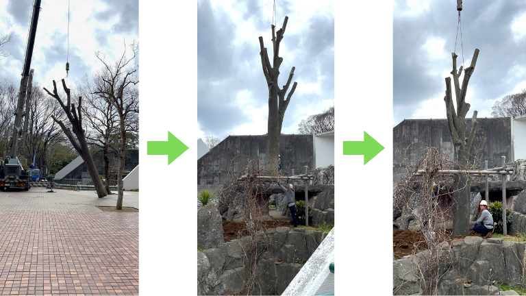 今回は3月18日(水)に、千葉市動物公園のニシゴリラの屋外展示場の樹木設置の場面に立ち会いました。